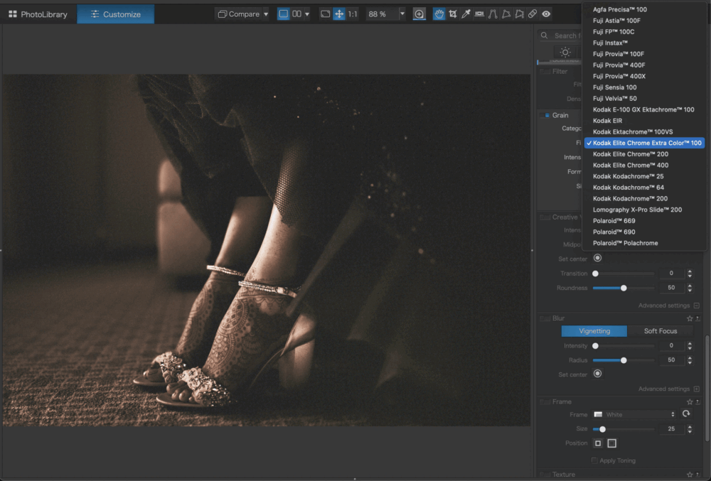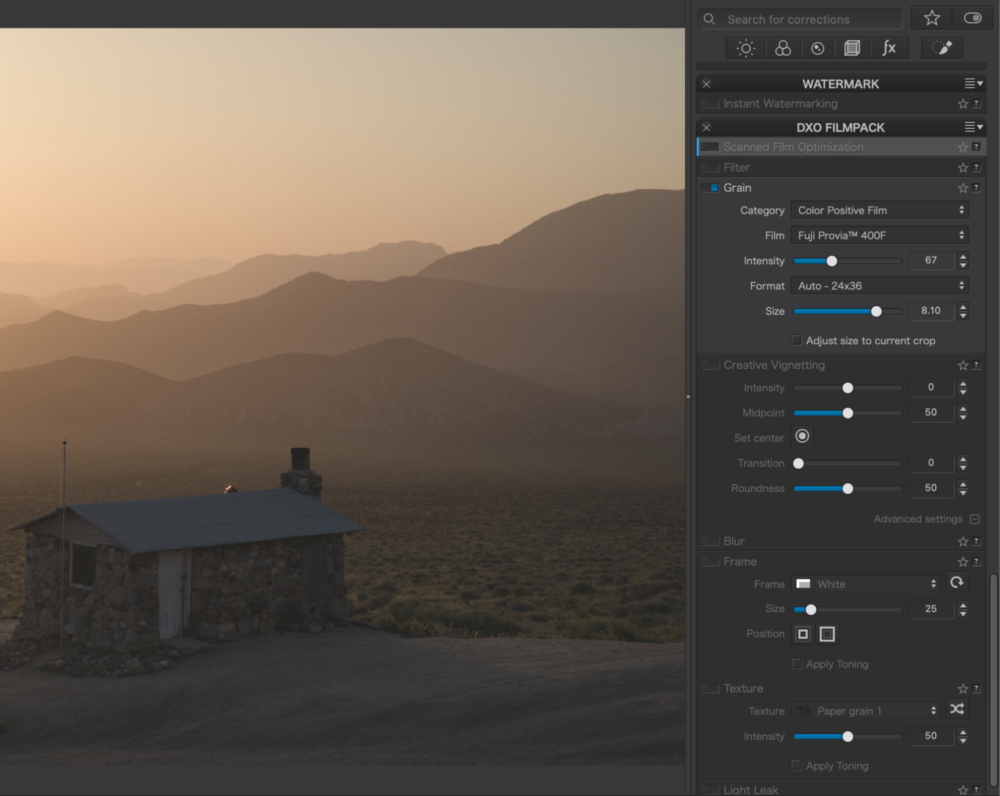 Again, you can dive deeper into the raw conversion, and play with the exact film used, as well as adjust or remove the various additional settings such as vignetting or frames, etc.