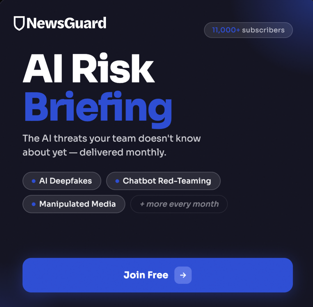 Each month, NewsGuard distills its latest AI reporting into a briefing on where and how AI systems fail. From red-teaming breakdowns to deepfakes and manipulated media, it helps organizations understand how AI risks are evolving — and why they matter.