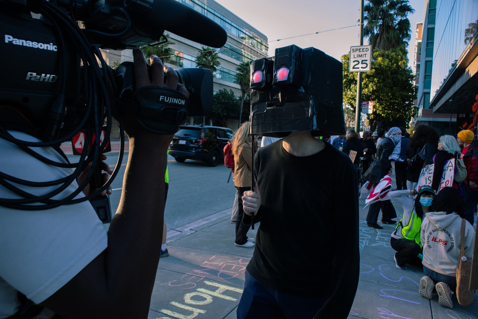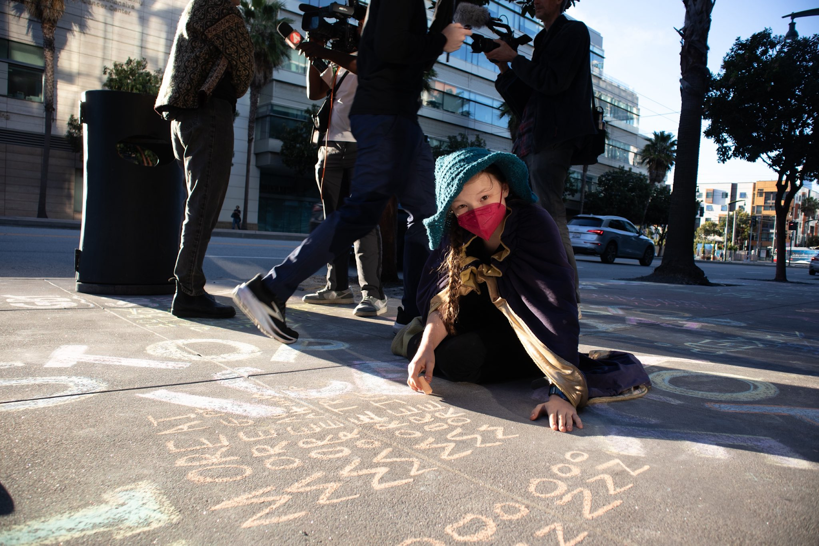The robot was echoing a sentiment that rang throughout the protest: that OpenAI’s employees are complicit in something bad. “Quit your job!” — another protest chant — was also written on the street in chalk, one of many colorful drawings protesters were chalking outside of headquarters.